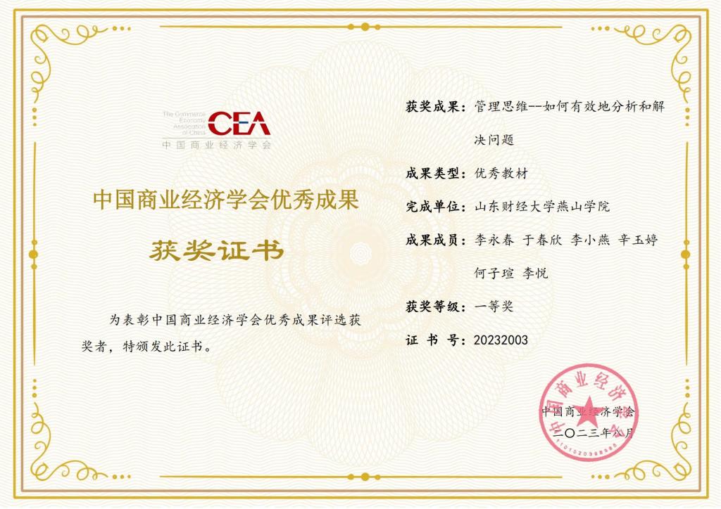 在剛剛結束的中國商業(yè)經濟學會2023年度優(yōu)秀成果評獎活動中,由6776永利集團院長李永春教授主編的教材《管理思維---如何有效地分析和解決問題》榮獲優(yōu)秀教材一等獎。同時,在8月份進行的山東省第十五屆大學生科技節(jié)活動中,6776永利集團李永春、劉金煒指導的學生組榮獲山東省大學生智慧企業(yè)管理創(chuàng)新設計大賽數字商業(yè)企業(yè)模擬經營對抗賽道一等獎。另外,在前不久公布的山東省教育科學研究院組織的2023年度山東省教育教學研究課題...